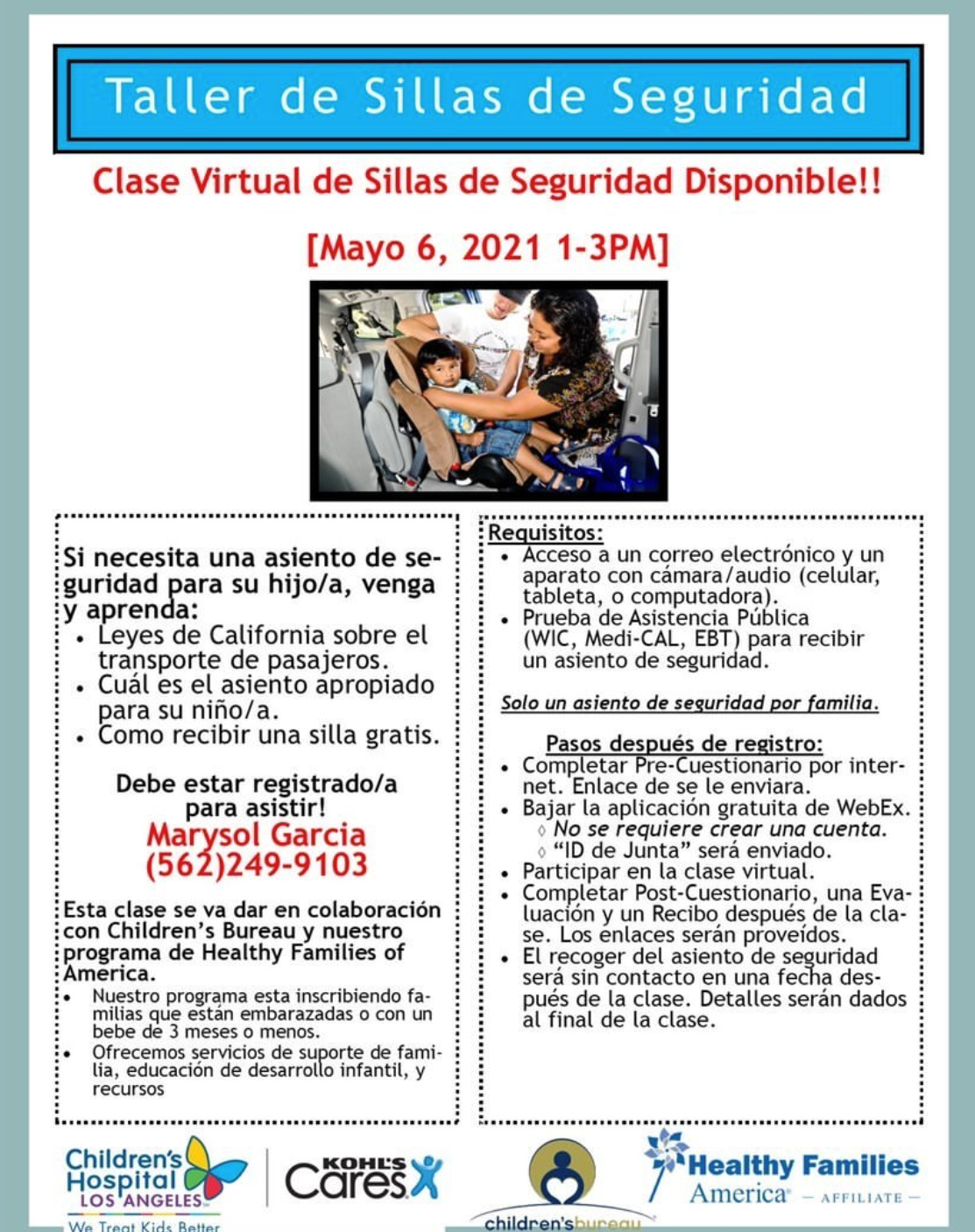 Este evento está abierto a familias de habla hispana que tengan más de 8 meses de embarazo o que tengan un hijo menor de 3 meses. Los participantes recibirán un asiento de seguridad gratuito. Para registrarse, llame a Marysol García al (562) 249-9103.